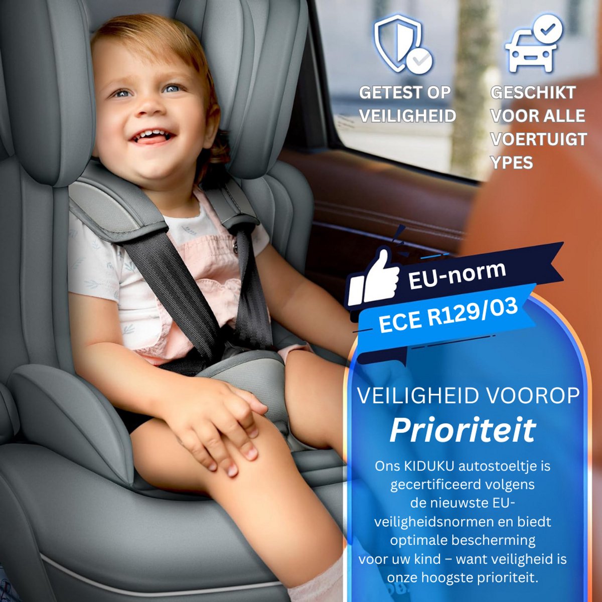 - Ultieme veiligheid: Voldoet aan de strengste Europese veiligheidseisen (ECE R129/03), met een stevige bevestiging via de autogordel of ISOFIX-systeem voor extra stabiliteit.