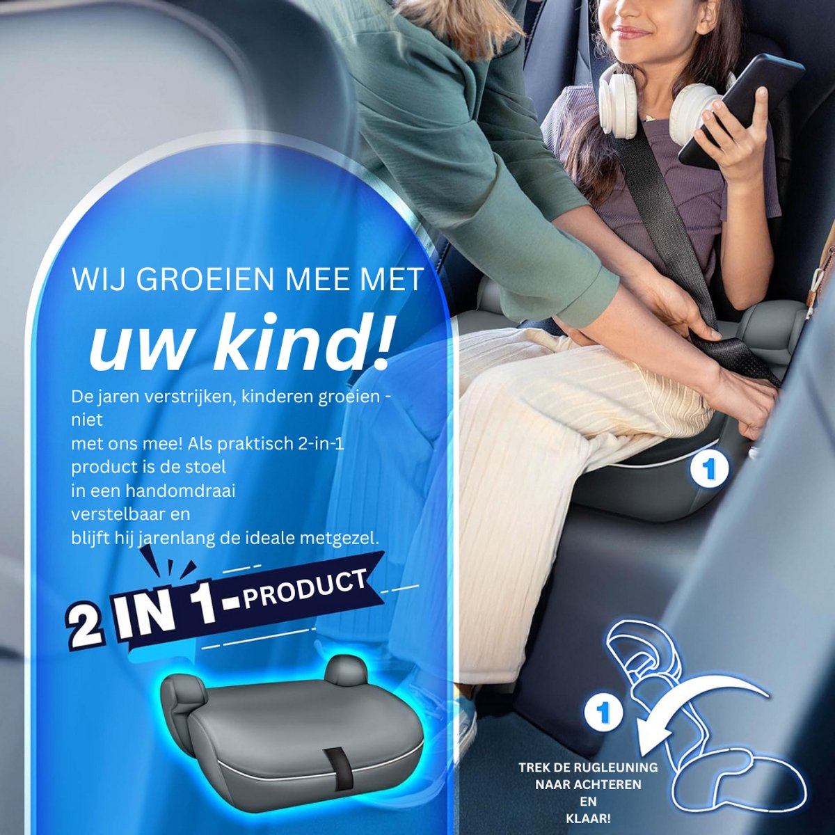- Meegroeiend ontwerp: Dankzij de verstelbare hoofdsteun (tot 6 cm) en verwijderbare rugleuning past het zitje zich moeiteloos aan de groei van je kind aan. Hierdoor kan je jarenlang genieten van een veilige en comfortabele oplossing.